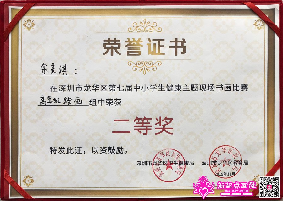 2019年11月24日,龙华区第七届中小学生健康主题现场书画大赛,匡老师带队,画苑钟梓力、余美淇、杨佳琳、张扬四人参赛,此次大赛来自龙华区62所中小学的800多人参加,画苑小朋友表现优秀,恭喜小朋友们在比赛中获得优异成绩:钟梓力、余美淇荣获二等奖;杨佳琳、张扬荣获优秀奖,加油!再接再厉哦!!